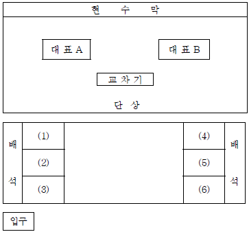 다음 달에 미국 샌디에고에 위치한 다국적 기업인 ABC회사와 기술제휴 업무협약식을 가질 예정이다. 이를 위해 ABC회사의 대표이사, 국제교류 이사, 그리고 기술개발 연구팀장 3인이 방문할 예정이다. 우리 회사 측에서는 김영철 사장, 권혁수 상무, 김진표 해외영업 팀장, 이진수 기술개발 팀장 4인이 업무협약식에 참석할 예정이다. 김영철 사장 비서는 협약식장의 좌석을 아래 그림과 같이 배치하였다. 다음 내용 중 가장 잘못된 것은?