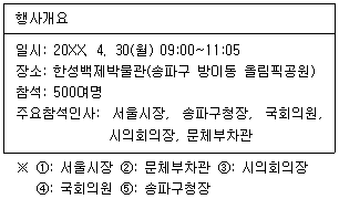 송파구청장 비서A양은 서울시 주최, 송파구청 주관으로 한성백제박물관 개관식 행사를 준비하고 있다. 행사개요는 아래와 같다. 주요 인사들이 많이 초청된 행사라, 자리배치 등 의전에 각별히 신경을 써서 준비하라는 구청장의 특별 지시가 있었다. 테이프커팅식 때 일반적으로 주요 인사들의 서 있는 위치가 정면에서 보았을 때 올바르게 배치된 것은?