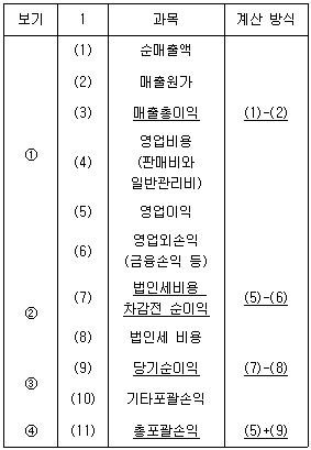 포괄손익계산서 보고서 양식은 다음과 같다. 각 과목에 대한 산정방식으로 옳지 않은 것은?