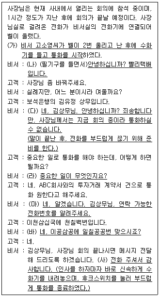 다음은 대기업의 계열사인 택배회사의 사장님 비서로 근무 중인 고소영씨가 전화를 받고 있는 장면이다. 내용 중 비서가 해야 하는 전화응대 방법으로 옳지 않은 구문이나 행동, 대처방법이 있으면모두 고르시오.