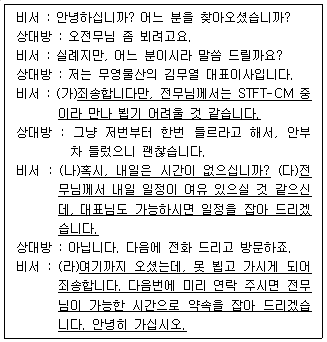 조이롬 비서는 상사를 찾아온 손님과 다음과 같은 대화를 나누었다. 비서가 올바르게 내방객을 응대한 부분을 고르시오.