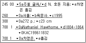 다음은 “서명: 주홍 글씨; 저자: N. 호돈 지음 ; 차영은 옮김; 발행처: 육문사; 발행연도: 1995”의 한국문헌자동화목록(KORMARC) 데이터이다. 밑줄 친 부분 중 옳지 않은 것은? (단, 띄어쓰기는 제외한다.)