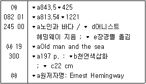 다음은 “헤밍웨이가 지은 미국 소설 노인과 바다”의 한국문헌 자동화목록(KORMARC) 데이터이다. ㈎~㈐에 각각 들어갈 표시기호(Tag)로 옳은 것은? (단, 띄어쓰기는 제외한다.)