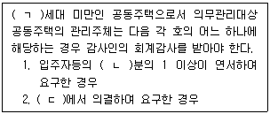 공동주택관리법 제26조(회계감사) 제2항 규정이다. ( )에 들어갈 아라비아 숫자와 용어를 쓰시오.
