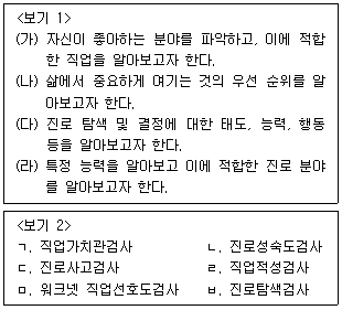 <보기 1>의 심리검사 목적과 이를 달성하기에 가장 적합한 <보기 2>의 심리검사를 바르게 연결한 것은?(순서대로 (가), (나), (다), (라))