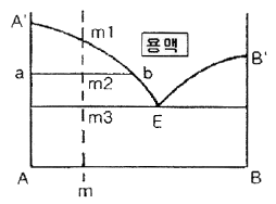 다음의 금속 상태도에서 합금 m을 냉각시킬 때 m2 점에서 결정 A와 용액 E와의 양적 관계를 옳게 나타낸 것은?