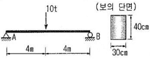 경간 ℓ=8m. 단면 30x40cm 되는 단순보의 중앙에 10t 되는 집중하중이 작용할 때 최대 횡응력은?