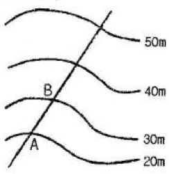 그림의 등고선에서 AB의 수평거리가 50m일 때 AB의 기울기는 얼마인가?