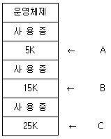 주기억장치 배치 전략 기법으로 최초 적합(First Fit) 방법을 사용한다고 할 때, 다음과 같은 기억장소 리스트에서 10K 크기의 작업은 어느 기억공간에 할당되는가? (단, 탐색은 위에서 아래로 한다.)
