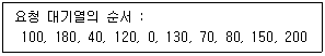 현재 헤드의 위치가 50에 있고, 요청 대기열의 순서가 다음과 같을 경우, C-SCAN 스케줄링 알고리즘에 의한 헤드의 총 이동거리는 얼마인가? (단, 현재 헤더의 이동 방향은 안쪽이며, 안쪽의 위치는 0으로 가정한다.)