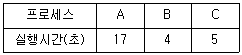 준비 상태 큐에 프로세스 A, B, C가 차례로 도착하였다. 라운드 로빈(Round Robin)으로 스케줄링할 때 타임 슬라이스를 4초로 한다면 평균 반환 시간은?