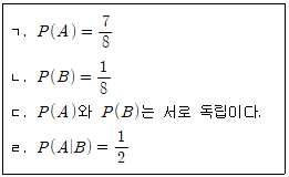 3개의 동전을 던지는 실험에서 사건 A는 3개의 동전 중 최소한 1개가 앞면이 나오는 경우라고 하고, 사건 B는 3개가 모두 같은 면이 나오는 경우라고 할 때, 아래 <보기>에서 옳은 것을 모두 고른 것은?