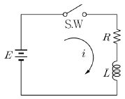 그림과 같은 RL회로에서 스위치 S.W를 넣는 순간의 기전력 E에서 t초 후 회로에 흐르는 전류 i는 어떻게 표시되는가?