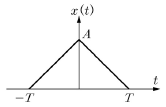 그림은 진폭이 A이고, 폭이 2T인 삼각 신호(triangular signal) x(t)를 나타낸 것이다. 신호x(t)의 푸리에 변환(Fourier transform)을 X(t)라고 할 때, 다음 중 X(f)=0에 해당하는 최소 주파수 f는?
