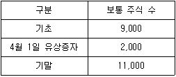㈜서울의 2015년 보통주의 변동내역은 아래와 같다. 4월 1일 실시한 보통주식의 유상증자는 주주우선 배정방식에 따른 것으로, 공정가치 미만으로 실시되었다. 유상증자 직전 주당 공정가치는 ₩80이며 유상증자 시 주당 실제 발행금액은 ₩40이다. 이때 2015년도 ㈜서울의 가중평균유통보통주식수는 몇 주인가? (단, 모든 계산은 월 단위 계산을 기준으로 하며, 이론적 권리락 주당공정가치 및 조정비율 계산 시 소수점 둘째 자리 이하는 버린다.)