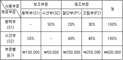 ㈜서울은 두 개의 보조부문 동력부(S1), 수선부(S2)와 두 개의 제조부문 절단부(P1), 조립부(P2)를 운영하고 있다. 2016년 중 부문 상호 간의 용역수수관계와 부문별로 집계된 원가는 다음과 같다. ㈜서울은 단계배분법에 의하여 보조부문원가를 배분하고 있다. 동력부(S1)의 원가부터 배분할 경우 절단부(P1)의 배분 후 원가는 얼마인가?