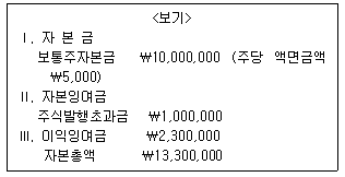 <보기>는 ㈜서울의 2018년 1월 1일 자본 관련 자료이다. 2018년 5월 초에 보통주 200주를 주당 ₩4,500에 발행(유상증자)하였으며, 11월 말에 자기주식 100주를 주당 ₩6,000에 현금 취득하였다. 2018년도 당기 순이익이 ₩500,000이었다면, 2018년 말 자본총액은?