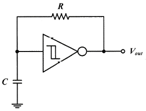 그림과 같이 74HC14를 사용하여 슈미트 트리거 발진기의 발진주파수는 몇 kHz 인가? (단, R = 10kΩ, C = 0.005 ㎌ 이다.)