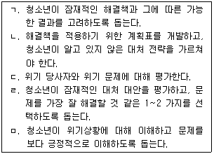 청소년 위기개입의 단계를 순서대로 옳게 나열한 것은?