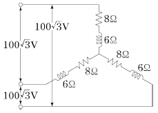 그림과 같은 평형 3상 Y 결선에서 각 상이 8Ω의 저항과 6Ω의 리액턴스가 직렬로 연결된 부하에 선간전압 100√3 (V)가 공급되었다. 이때 선전류는 몇 A 인가?