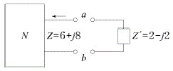 a-b 단자의 전압이 50∠0˚ (V), a-b단자에서 본 능동 회로망(N)의 임피던스가 Z=6+j8(Ω)일 때, a-b 단자에 임피던스 Z′=2-j2(ohm)를 집속하면 이 임피던스에 흐르는 전류(A)는?