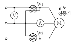 그림은 평형 3상 회로에서 운전하고 있는 유도전동기의 결선도이다. 각 계기의 지시가 W1=2.36[kW], W2=5.95[kW], V=200[V], I=30[A]일 때, 이 유도 전동기의 역률은 약 몇 [%]인가?
