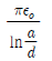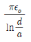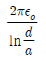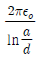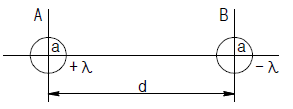 그림과 같이 반지름 a[m], 중심간격 d[m], A에 +λ[C/m], B에 -λ[C/m]의 평행 원통도체가 있다. d ≫ a라 할 때의 단위길이당 정전용량은 약 몇 F/m 인가?