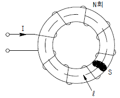 그림과 같이 일정한 권선이 감겨진 권회수 N회, 단면적 S[m2], 평균자로의 길이 l[m]인 환상솔레노이드에 전류 I[A]를 흘렸을 때 이 환상솔레노이드의 자기인덕턴스[H]는? (단, 환상철심의 투자율은 μ 이다.)