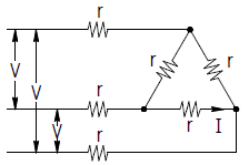 같은 저항 r[Ω] 6개를 사용하여 그림과 같이 결선하고 대칭 3상 전압 V[V]를 가하였을 때 흐르는 전류 I는 몇A 인가?