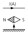 그림과 같이 도선에 전류 I[A]를 흘릴 때 도선의 바로 밑에 자침이 이 도선과 나란히 놓여 있다고 하면 자침의 N극의 회전력의 방향은?
