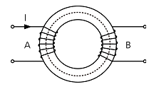 그림과 같은 환상철심에 A, B의 코일이 감겨있다. 전류 I가 120 A/s로 변화할 때, 코일 A에 90V, 코일 B에 40V의 기전력이 유도된 경우, 코일 A의 자기인덕턴스 L1[H]와 상호인덕턴스 M[H]의 값은 얼마인가?