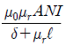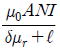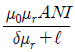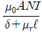 철심환의 일부에 공극(air gap)을 만들어 철심부의 길이 ℓ(m), 단면적 A(m)2, 비투자율이 μ이고 공극부의 길이 δ(m)일 때 철심부에서 총권수 N회인 도선을 감아 전류 I(A)를 흘리면 자속이 누설되지 않는다고 하고 공극 내에 생기는 자계의 자속 ø0(Wb)는?