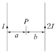 그림과 같이 평행한 두 개의 무한 직선 도선에 전류가 각각 I, 2I인 전류가 흐른다. 두 도선 사이의 점 P에서 자계의 세기가 0이다. 이 때 a/b 는?