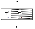 그림과 같은 정전용량이 C0[F]가 되는 평행판 공기콘덴서가 있다. 이 콘덴서의 판면적의 2/3가 되는 공간에 비유전율 Єs인 유전체를 채우면 공기콘덴서의 정전용량[F]은?
