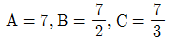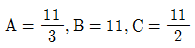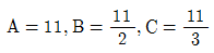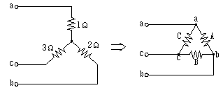 다음과 같은 Y결선 회로와 등가인 △결선 회로의 A, B, C 값은 몇 Ω 인가?