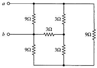 9Ω과 3Ω인 저항 6개를 그림과 같이 연결하였을 때, a와 b 사이의 합성저항(Ω)은?