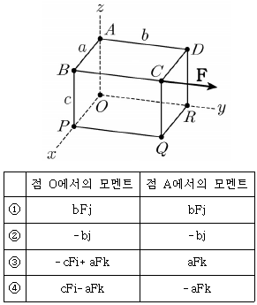 <보기>와 같이 직육면체 물체(OPQRABCD)에 힘 F가 점 C에 작용할 때 점 O와 점 A에서의 모멘트는? (단, F=Fj이다.)