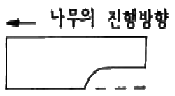 수동식 기계대패로 판재를 대패질 했을 때 그림과 같이 뒤가 패었다면 무엇을 조정하면 좋은가?