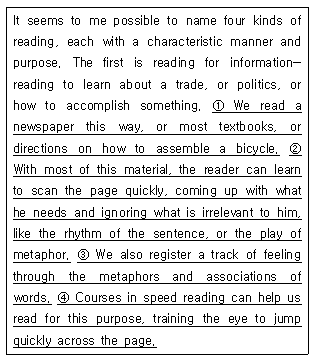 With most of this material, the reader can learn to scan the page quickly, coming up with what he needs and ignoring what is irrelevant to him, like the rhythm of the sentence, or the play of metaphor.