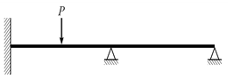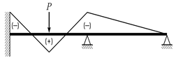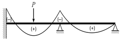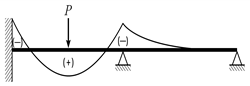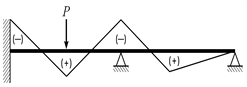 그림과 같은 연속보에 발생하는 모멘트도의 개형으로 옳은 것은? (단, P는 집중하중이고, 보의 자중은 무시한다)