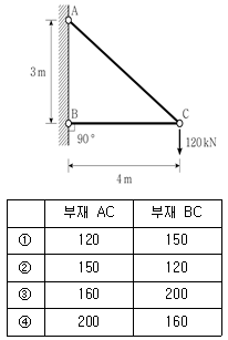 그림과 같은 트러스에서 부재 AC와 BC에 작용하는 부재력[kN]의 절댓값을 바르게 연결한 것은? (단, 부재의 자중은 무시한다)