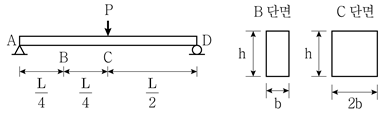 그림과 같이 직사각형 단면을 가지는 단순보에서 B점과 C점에 작용하는 최대 휨응력에 대한 설명으로 옳은 것은? (단, 보의 자중은 무시하며, 보의 전 길이에 걸쳐 재질은 동일하다)
