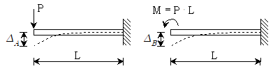 그림과 같이 캔틸레버 보의 자유단에 집중하중(P)과 집중모멘트(M=P·L)가 작용할 때 보 자유단에서의 처짐비 △A:△B는? (단, EI는 동일하며, 자중의 영향은 고려하지 않는다)