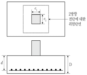 그림과 같은 철근콘크리트 직사각형 기초판에서 2방향 전단에 대한 위험단면의 면적은? (단, c1, c2는 기둥의 치수, d는 기초판의 유효깊이, D는 기초판의 전체 춤이다)