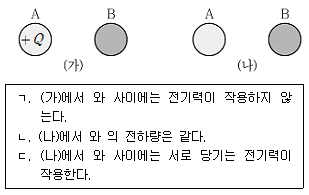 그림 (가)는 동일한 도체구 와 를 나타낸 것이다. 는 의 전하로 대전되어 있고 는 대전되어 있지 않다. 그림 (나)는 (가)의 두 도체구를 접촉시켰다가 다시 처음 위치로 떼어 놓은 것을 나타낸 것이다. 이에 대한 설명으로 <보기>에서 옳은 것만을 모두 고른 것은?