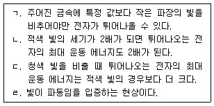 금속 표면에 적색 빛을 비출 때 표면에서 전자가 튀어나오는 현상과 관련된 설명으로 <보기>에서 옳은 것만을 고른 것은?