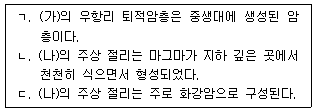 다음은 영희가 서로 다른 두 지역 (가)와 (나)를 지질 답사한 후 작성한 보고서의 일부이다. 이에 대한 설명으로 <보기>에서 옳은 것만을 모두 고른 것은?