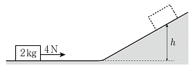 그림과 같이 수평면에 정지해 있던 질량이 2kg인 물체에 수평 방향으로 4N의 힘을 2초 동안 작용하였다. 물체가 수평면을 지나서 경사면을 따라 도달할 수 있는 수평면으로부터의 최대 높이 h[m]는? (단, 수평력이 작용되는 동안 물체는 수평면에 있고, 물체의 크기 및 모든 마찰과 공기 저항은 무시하며, 중력 가속도는 10m/s2이다)