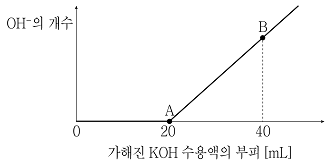 그림은 황산(H2SO4) 수용액 20mL에 수산화 칼륨(KOH) 수용액을 조금씩 가했을 때, 이 용액에 존재하는 수산화 이온(OH-)의 개수 변화를 나타낸 것이다. 이에 대한 설명으로 옳은 것은?