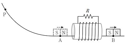 그림은 자석을 P점에서 가만히 놓아 마찰이 없는 레일을 따라 저항 R이 연결된 코일을 지나는 것을 나타낸다. A와 B는 같은 높이의 점이며 코일 중심에서 같은 거리만큼 떨어져 있다. 자석이 A와 B를 지날 때의 물리량을 비교한 것으로 옳은 것은? (단, 공기 저항은 무시한다)